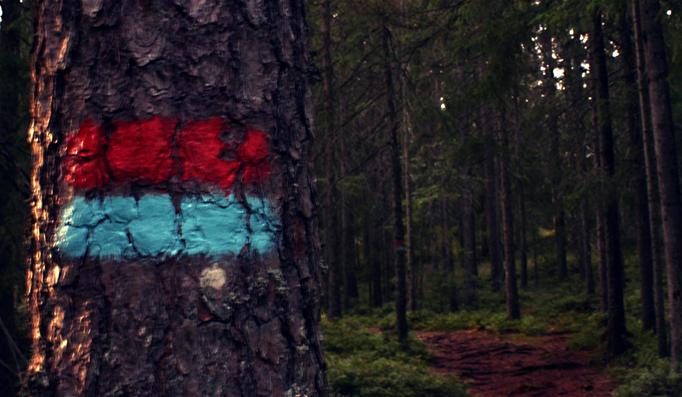 Stien er smal . Noen steder er den dekket av store steiner. Den går forbi stille vann der fiskene hopper og lager ringer på overflaten. Beina blir fulle av skraper etter busker og torner som har lagt seg over veien. Men det jeg liker aller minst med en slik tur, det er når stien deler seg i to eller kanskje tre og fire. Hvilken vei er den rette? Hvordan skal jeg komme fram til målet? Mens jeg står og klør meg i hodet, får jeg øye på det som løser hele problemet. Et rødt merke på en trestamme lengre borte forteller hvilken sti som fører fram. Jeg fortsetter og kjenner meg trygg. Så lenge jeg ser de røde merkene.